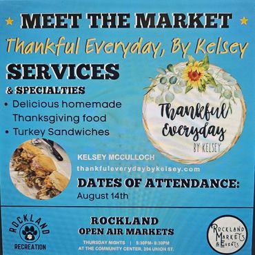 Come join Rockland's Open Air Market a small vendor event where Thankful Everyday by Kelsey will be the food vendor for the Thursday, August...