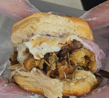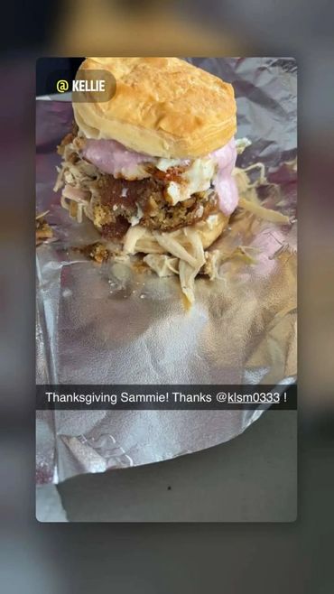 Comes with all the fixins' - turkey, mashed, stuffing & green bean casserole with a cranberry cream cheese spread on a buttery Grands biscuit